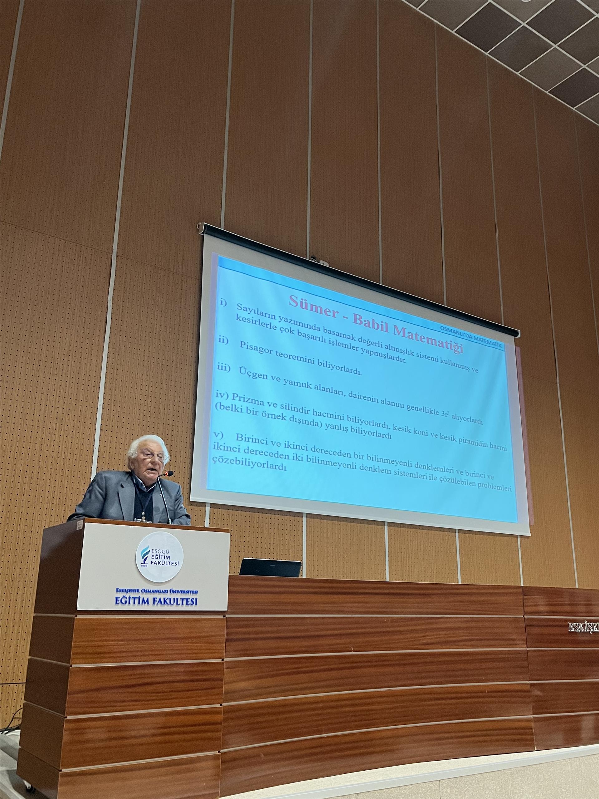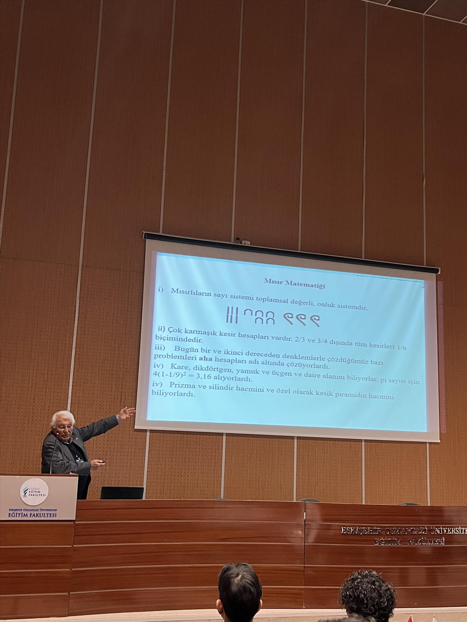 Eskişehir Osmangazi Üniversitesi Eğitim Fakültesi ve Matematik Kulübü iş birliğiyle düzenlenen "Matematiğin Tarihi" başlıklı konferans, 26 Kasım 2025 tarihinde Zuhal Çubukçu Konferans Salonu’nda gerçekleştirildi. Etkinliğimizde Sümer tabletlerindeki hesaplamalardan Babil astronomisine, Eski Mısır'ın geometrisinden Antik Yunan'ın ispatlarına kadar pek çok konu ele alındı. Tarih, kültür ve matematiğin kesiştiği bu keyifli söyleşiye katılan tüm öğrencilerimize ve değerli sunumuyla bizleri aydınlatan Prof. Dr. Mehmet ÜREYEN hocamıza teşekkür ederiz.